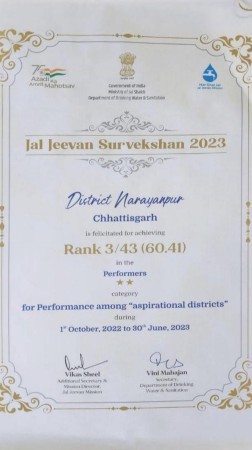 इसे सफलतापूर्वक आगे बढ़ाने के लिए केंद्र सरकार ने आंकाक्षी जिले के अंतर्गत नारायणपुर जिले को सम्मानित किया। केंद्र सरकार द्वारा जलजीवन सर्वेक्षण 1 अक्टूबर 2022 से 30 जून 2023 तक कराया गया। इसमें आकांक्षी जिलों अंतर्गत नारायणपुर जिले का कार्य उत्कृष्ट पाया गया। इस जिले के लिए जलजीवन मिशन ने 30 हजार 322 परिवारों तक शुद्ध पेयजल पहुँचाने का लक्ष्य रखा था इसमें 18 हजार 72 घरों तक नल कनेक्शन पहुँचाया जा चुका है। 14 गाँव ऐसे हैं जहां शतप्रतिशत परिवारों को कनेक्शन दिया जा चुका है।