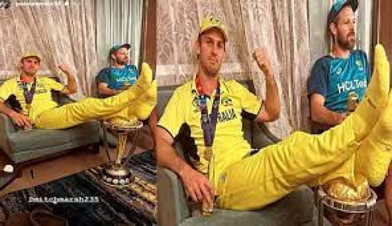 नई दिल्ली । भारत और ऑस्ट्रेलिया के बीच वर्ल्ड कप का फाइनल मुकाबला 19 नवंबर को अहमदाबाद के नरेंद्र मोदी स्टेडियम में खेला गया। ऑस्ट्रेलिया की टीम ने मुकाबले में आसान सी जीत दर्ज की। शानदार बल्लेबाजी के दम पर ऑस्ट्रेलिया ने छठी बार विश्व कप का खिताब उठाया। इस बीच सोशल मीडिया पर एक फोटो वायरल हो रहा है, जिसमें ऑस्ट्रेलिया के मिचेल मार्श ट्रॉफी पर पैर रखे नजर आ रहे हैं।
